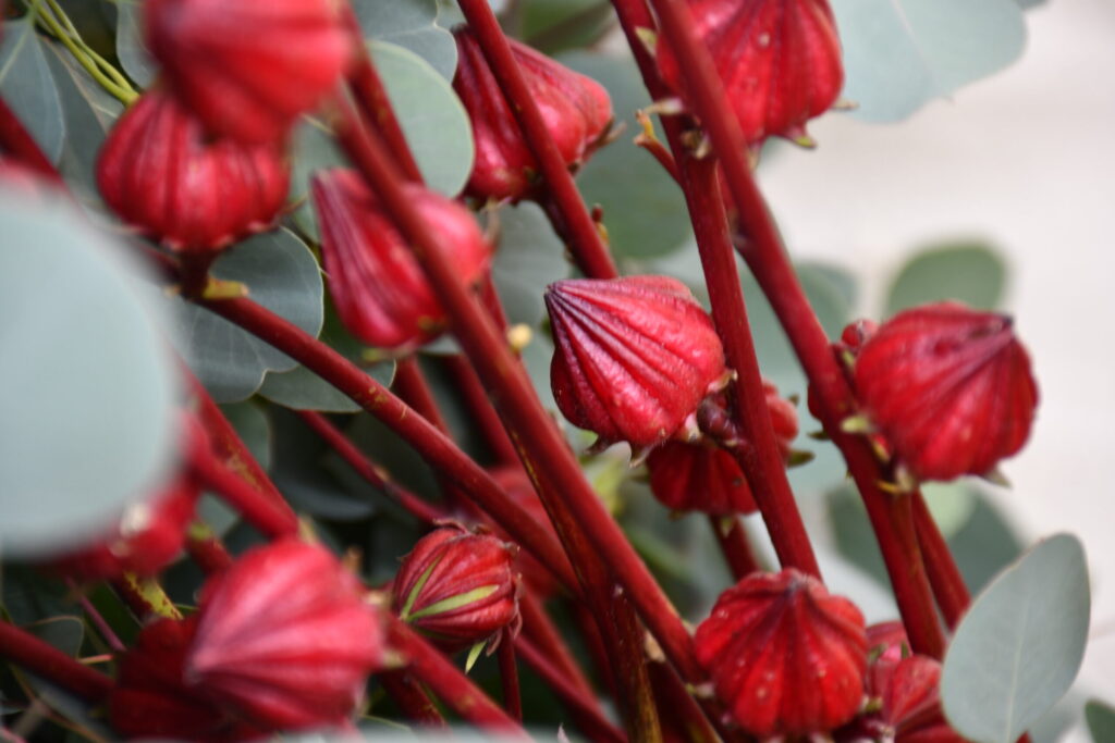 深紅の枝に、同じ色の固い実をつけた「ローゼル」。